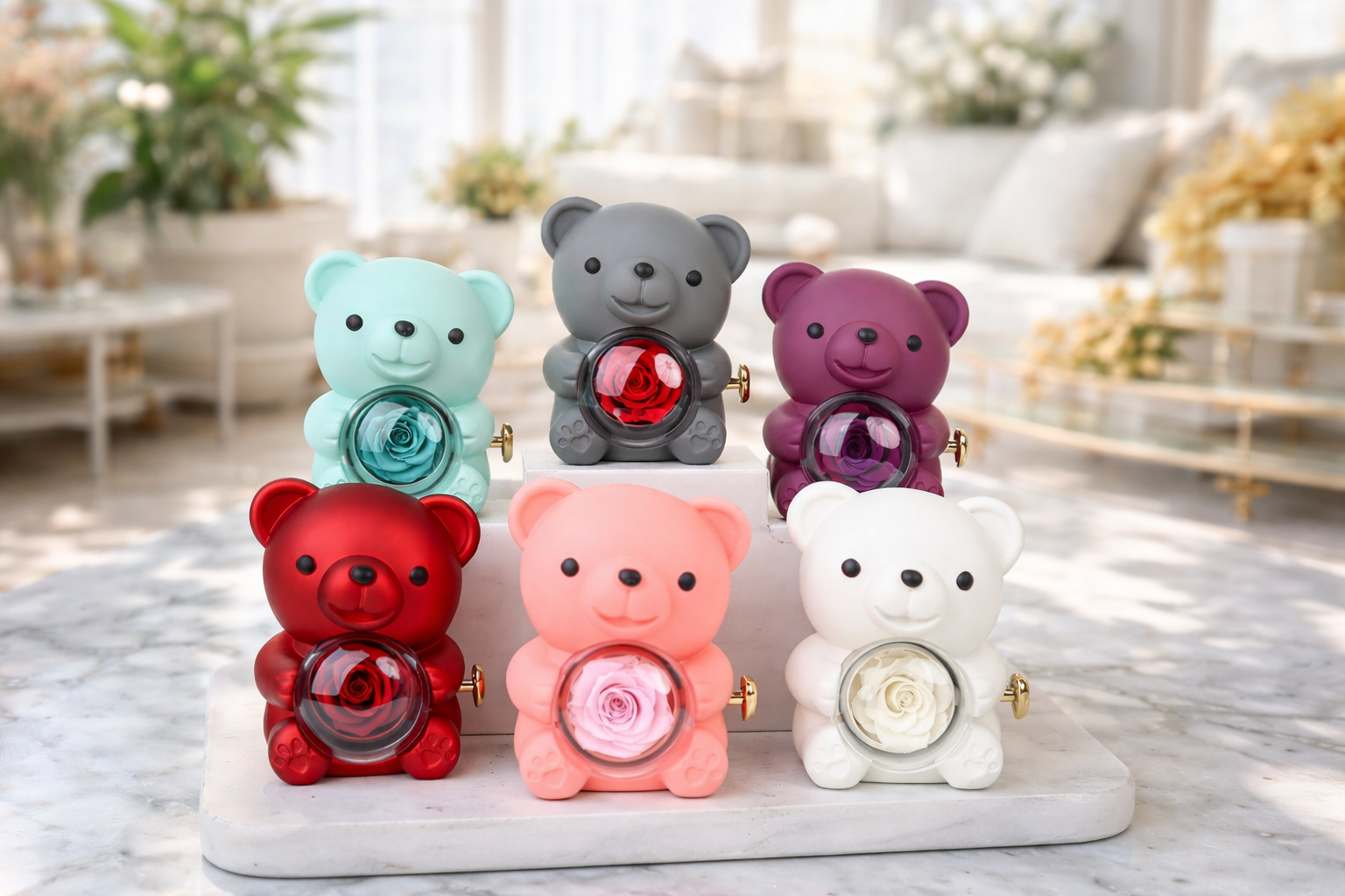 Des roses en savon délicates, accompagnées de doux ours en peluche, créant une harmonie parfaite.
